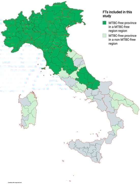 Six of the twelve FT regions, namely Trentino-Alto Adige, Abruzzo, Lombardy, Piedmont, Tuscany, and Veneto, did not acquire their MTBC-free status directly, but after the free status acquisition of one or more of their province/s in the previous years (Table 1). By removing these provinces from the overall count, 23 provinces have been declared as FTs. It should be also noted that in the Sardinia region, a recent reform of the provinces was made in 2023 [33]. However, considering that the reform should have been completed in 2024, the data in this study are those related to the division in the five provinces in force from 2016 to 2021. Due to this, the overall number of FT provinces drops further to 19. The FTs finally analysed (MTBC-free region and province) are detailed geographically in Figure 2.