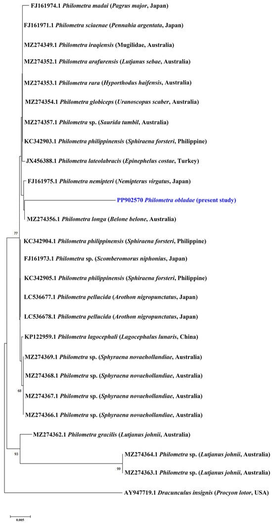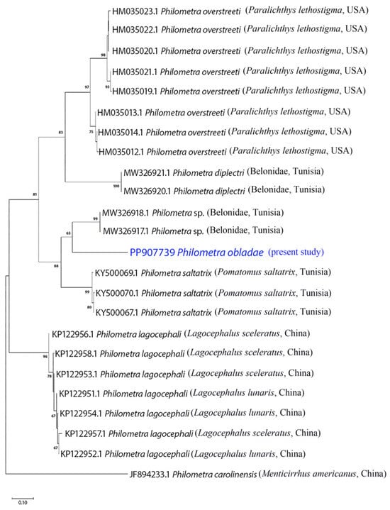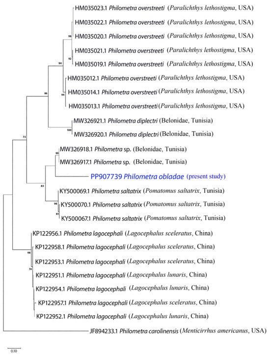 All isolates showed positive amplification for 18S and cox1 genes. Partial sequences of 18S rRNA (823 nt, 5 replicates) and cox1 (309 nt, 5 replicates) were obtained for Ph. obladae. The nucleotide sequences of the amplified products of each gene were identical among the isolates from all specimens collected. The representative DNA sequences for 18S rRNA and cox1 were submitted to GenBank (accession numbers PP902570 and PP907739, respectively). The representative sequences of 18S rRNA had 94.45% and 93.73% similarity to that of Philometra longa Moravec, Barton and Shamsi, 2021 (MZ274356.1) and Philometra sp. (MW328560.1) from GenBank, with 49 and 55 nt differences, respectively. The obtained sequences of cox1 had 84.67% similarity to Philometra sp. (OP221143.1) from GenBank, with 48 nt difference. The alignments of 18S rRNA and cox1 sequences used 667 and 242 informative positions for NJ, ML, and BI analyses. The dataset included sequences of representative seawater Philometra species deposited in GenBank. The phylogenetic trees for both 18S rRNA and cox1 markers resulted in a very similar topology, with reasonably high posterior probabilities and bootstrap values in most of the nodes. Philometra obladae (Philometridae) 18S rRNA sequences grouped with Philometra longa (MZ274356.1) and Philometra nemipteri Luo, 2001 (FJ161975.1) (Figure 1, Figure 2 and Figure 3), while Ph. obladae cox1 sequences grouped with Philometra sp. (MW326917.1) and Philometra sp. (MW326918.1). Comparisons of the results of two loci indicated that the sequences of Ph. obladae are related to those of other Philometridae isolated from different hosts and different geographic areas, such as Ph. longa and Philometra sp. from Belonidae, caught off Australia and the United States, respectively [,], and Ph. nemipteri from Nemipterus virgatus Houttuyn, 1782, caught off Japan [] (Figure 4, Figure 5 and Figure 6).