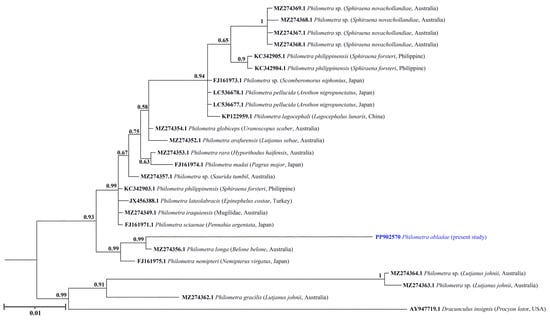Phylogenetic relationships among the isolates of the present study and other Philometra sp. as inferred from sequences of cox1 analysed via the BI method. Numbers at the nodes (posterior probability values) refer to BI analysis. GenBank accession numbers are indicated before species names. The newly analysed species in this study is marked in blue. Isolation source and location information are reported in brackets. Outgroup: Philometra carolinensis.