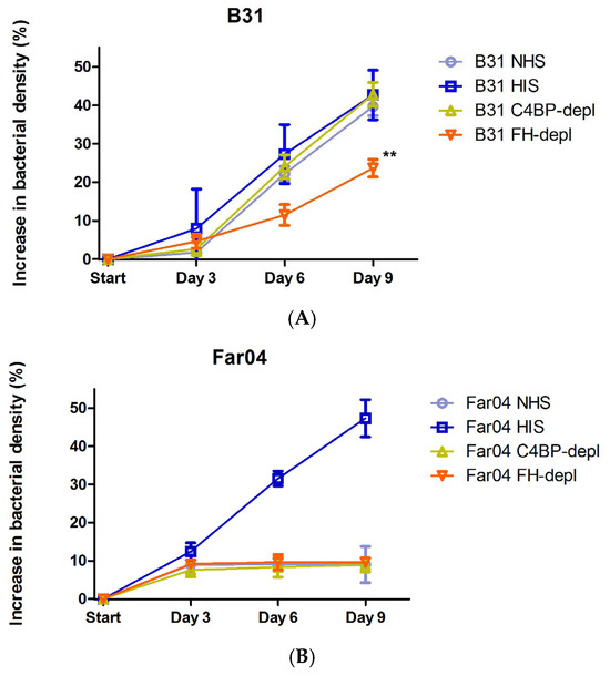 Growth curves of strain B31 (A) and Far04 (B) after incubation in NHS, HIS, and serum depleted of complement regulators. Mean increases in bacterial growth with 95% CI are shown. Statistical analysis was performed using one-way ANOVA followed by Dunnett’s post hoc test where appropriate, with growth in NHS serving as control. Significant differences marked with ** (p-value < 0.01).