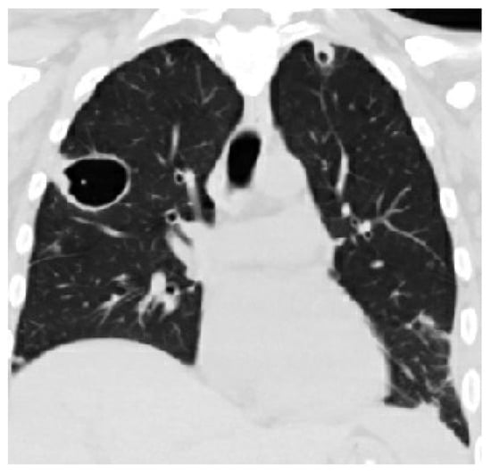 Necrotizing pneumonia arises when a pulmonary infection triggers severe inflammation, leading to parenchymal damage, tissue necrosis, and the liquefaction of consolidated lung tissue [4]. Frequently, the infection results in the destruction of pulmonary vasculature by thrombus formation, thus restricting blood supply to the affected area. This compromised perfusion fosters an environment conducive to lung parenchymal necrosis, uncontrolled bacterial replication, and reduced antibiotic penetration [5]. Consequently, the liquefaction of lung parenchyma can culminate in pulmonary gangrene. The diagnosis of necrotizing pneumonia typically relies on CT imaging findings, which commonly reveal diminished parenchymal contrast enhancement due to inadequate perfusion, alongside the presence of multiple micro-abscesses [4,5]. Although chest X-rays may depict radiolucent lesions suggestive of necrosis, they often lack sensitivity, necessitating CT scans for a definitive diagnosis [5].