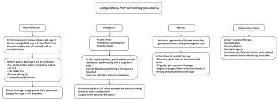 A chart depicting potential complications from necrotizing pneumonia and a summary of the recommendations for management.