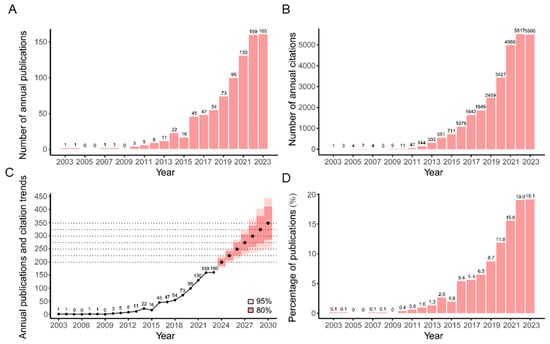 Publication and citation analysis. (A) Annual publications from 2003 to 2023. (B) Annual citations from 2003 to 2023. (C) Proportional distribution of publication volumes from 2003 to 2023. (D) Annual publication forecasts until 2030.