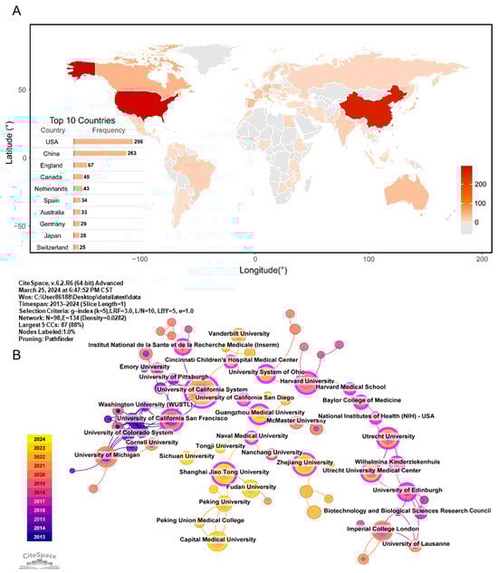 Analysis of countries and institutions. (A) Distribution of publication quantities worldwide. The table shows the top ten countries by publication count. (B) Collaborative network of publishing institutions.