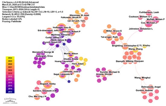 The H-index is a comprehensive quantitative index for evaluating researchers’ academic output quantity and level [23]. Among 485 researchers, Huffnagle, Gary B. from the University of Michigan Medical School in the U.S. leads with the highest H-index, highlighting his significant influence in the field of the lung microbiome. His work suggests that the lung microbiome not only affects disease susceptibility and causation but is also influenced by disease activity and response to treatment [3,24,25,26]. A deeper comprehension of these dynamics could lead to the development of novel therapies and preventive strategies, aiding in the identification of at-risk populations and improving targeted interventions [26,27]. This is followed by Bogaert, Debby from MRC Centre for Inflammation Research, United Kingdom. Bogaert, Debby focuses on the relationship between the respiratory microbiome and diseases in children and infants [28,29,30]. Using a multi-omic approach, Bogaert has revealed species-specific host–microbe interactions that could predict susceptibility to respiratory tract infections, contributing valuable insights to the field [31]. As is shown in Table 3, there are no authors whose centrality is greater than or equal to 0.10 among all the authors, indicating that there are no authors with significant influence in the lung microbiome field.