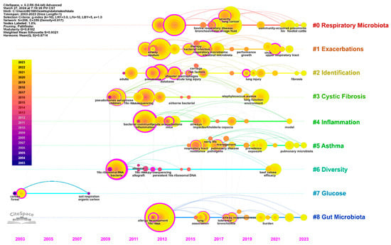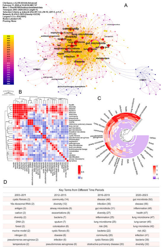 A citation burst means that the number of citations increases in a short period of time, so burst detection can reveal the most active areas and emerging trends in the network. Using the keyword outburst function of CiteSpace, the top 20 outburst keywords are shown in Table 3. The keywords with strong outbreak intensity in the last five years were “staphylococcus aureus” (2019–2020, strength: 3.37), “lung microbiota” (2019–2023, strength: 4.76), “injury” (2021–2023, strength: 3.91), “virus” (2021–2023, strength: 3.7), and “efficacy” (2021–2023, strength: 3.13). The ring heatmap and time axis view of keywords in Figure 4C and Figure 5 reveal a discernible trend in research, shifting from a global perspective—gaining a broad understanding of the microbiome—to a more localized focus, where attention is concentrated on specific mechanisms and the role of the microbiome in particular diseases or symptom clusters.