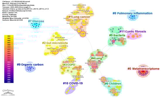 Co-citation analysis identifies a relationship between two articles that are cited together, indicating a shared research foundation and a significant source of knowledge. The frequency of co-citation signifies an article’s importance in its field. A total of 641 citations from 2003 to 2024 were extracted to conduct a co-citation analysis (Figure 6 and Figure S5). The co-cited network contains 12 clusters with significant modularity and profile scores (Q = 0.846; S = 0.973). The top five clusters include #0 metatranscriptome, #1 lung cancer, #2 gut microbiota, #3 COPD, and #4 lung, all representing the recent literature. The top 30 most cited articles, with a minimum of 25 co-citations each, are predominantly post-2014 publications (Table S2). Double graph overlay is a method to analyze the relationship between existing research and future research trends. The double-graph superposition of the journal clustering is presented in Figure S6. The left side is the citing journals, and the right side is the cited journals. The labels indicate the disciplines covered by the journals, and colored paths indicate the citation relationships. In Figure S6, there are two important paths: the yellow citation path shows that research in molecular, biology, and immunology journals is frequently cited by molecular, biology, and genetics journals; the green citation path indicates that the research in medicine, medical, and clinical journals is frequently cited by molecular, biology, and genetics journals. These findings reveal that research on the lung microbiome has progressed from basic composition to exploring specific mechanisms and the clinical value of diseases.
