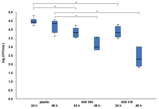 Survival of S. Infantis 323/19 on different surfaces (plastic cut from a feeder and stainless steel types AISI 304 and AISI 316) after incubation at 20 °C for 24 and 48 h. * indicates a statistically significant difference (p < 0.05).