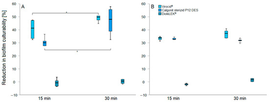 The reduction in culturability of S. Infantis 323/19 in (A) 24 h and (B) 48 h old biofilms, following treatment with disinfectants at recommended concentrations for 15 or 30 min. * indicates a statistically significant difference (p < 0.05).