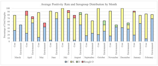The Salmonella positivity rate and serogroup distribution fluctuated over time for all sample types. Direct fecal grab samples maintained a high positivity rate throughout the year, averaging between 79.2 and 100% of the samples per month. Environmental samples showed the highest positivity in the months of June (87.5%), July (93.75%), and August (87.5%) and the lowest positivity in November (50.0%) (Figure 2). Comparisons between the positivity of direct fecal grabs and environmental samples by month showed significant differences in October (p-value = 0.005), November (p-value = 0.009), and December (p-value = 0.002) by pairwise tests of equal proportions.