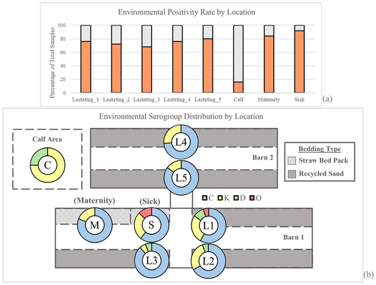 Summary of the farm layout, Salmonella recovery rate, and serogroup distribution from environmental samples. (a) Percentage of samples from which Salmonella was recovered by location. (b) Pie chart of serogroups obtained from environmental locations on the farm (see Supplementary Materials). Locations are designated as follows: C = calf area; M = maternity pen; S = sick pen, L1–L5 = lactating pens 1–5.