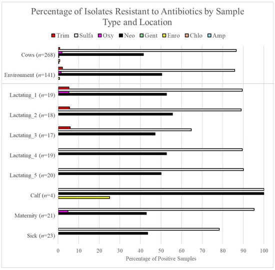 Overall, antimicrobial resistance against sulfa was found to be the highest, with 86.6% of direct fecal grab isolates and 85.8% of environmental isolates exhibiting resistance. When enumerated over time, sulfa resistance was observed with the highest frequencies in September, December, January, and February, with 100% of the isolates showing resistance, whereas the lowest frequencies were found in April (36.4%) and March (52.6%) (Figure 5). For our environmental samples, resistance to sulfa was largely present year-round, with 100% resistance in June, August, September, October, November, December, January, and February, whereas the lowest percent resistance was found for March (21.5%), May (55.6%), April (66.7%), and July (66.7%). Comparisons of sulfa resistance between direct fecal grab and environmental samples revealed no significant differences in prevalence aside from July, where direct fecal grab isolates exhibited significantly more resistance than environmental isolates (cow = 95.8%, environment = 66.7%, p-value = 0.046 via pairwise tests of equal proportions). Within locations in the environment, sulfa resistance was most commonly found in the calf area and the maternity pen at percent resistances of 100% and 92%, respectively. The lowest percent sulfa resistance was found in lactating pen 3 (64.7%) and the sick pen (78.3%).