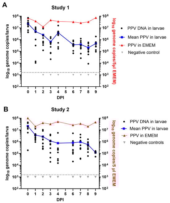 Following ingestion of 5 µL of EMEM containing PPV (or not, Negative control), the mealworm larvae were incubated for up to 9 days at 27 °C. Results obtained from the extraction and assay for PPV DNA, typically from 10 larvae collected on a daily basis (except for day 5), in two separate experiments using different batches of mealworm larvae, are shown in Figure 3. In both studies, in each 5 µL dose, the larvae will have ingested about 6.5 × 107 PPV genome copies. In Study 1, the extraction and assay for the PPV DNA within these larvae appears to have worked efficiently since, on average, about 2.3 × 107 PPV genome copies/larva were detected on day 0 (Figure 3A). It is apparent that there was then a decline in the level of PPV DNA detected within the larvae during the first few days of incubation, with a mean level of 6.5 × 105 PPV genome copies/larva being detected at 3 days post ingestion. However, during the period of 6–9 days post inoculation there was rather a slow change in the level of PPV in the larvae and they still retained a mean level of about 4.7 × 105 PPV genome copies/larva after 9 days (Figure 3A). This is about 1% of the ingested dose. It is also apparent that the PPV in EMEM remained at an almost unchanged level during the entire 9-day period, confirming its high stability under these conditions (27 °C). Very similar results were observed in Study 2, within an independent experiment, using a different batch of mealworm larvae. The PPV was again found to be present at a level of >1.2 × 105 genomes/larva after 9 days (see Figure 3B).