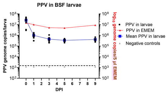 The presence of PPV DNA in individual BSF (H. illucens) larvae (typically 10 larvae were assayed at each time point) at 0 days post ingestion (DPI) and subsequently, at the indicated DPI, was quantified by qPCR and values were converted to log10 genome copy numbers/larva using a standard curve. Levels below 103.1 PPV genomes/larva were below the detection limit (indicated by the dashed line). PPV incubated in EMEM at the same temperature (27 °C) was assayed at the same time points. Negative controls were larvae fed on EMEM, without virus.