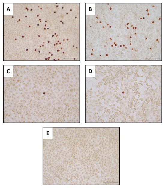 As a positive control for the IPT, cells were treated with the diluted PPV stock without incubation (Figure 5A) or following its incubation for 9 days at 27 °C (Figure 5B). These results showed that there was no marked reduction in the virus infectivity titer after the 9 days of incubation in EMEM, as expected from Figure 2. Reading the wells with cells that had adsorbed undiluted larval filtrate was challenging. Therefore, it was clearer to observe positive staining results wells when the cells had adsorbed the 10-fold diluted filtrates (see Figure 5C–E) although this obviously reduces the possible number of infected cells observed within each image. The collected staining results showed that infectious PPV could be detected in the mealworm larvae at 0 DPI and up until 3 DPI, when 3 out of the 5 tested virus-fed larval samples stained positive for PPV antigens (see Table 1). However, no staining was observed in cells treated with homogenates produced from larvae at 6 or 9 DPI or in cells treated with homogenates from larvae fed with MEM (Table 1 and Figure 5E).