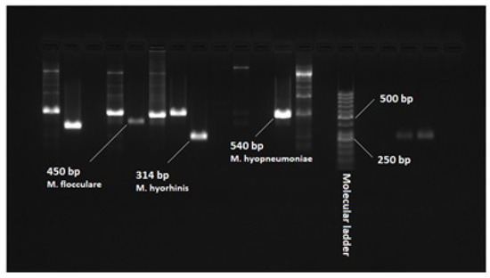 PCR results from the pig lung samples for Mycoplasma testing using primers targeting intergenic spacer (IGS) region between 16S and 23S rRNA genes (species-specific PCR). M. hyopneumoniae produced a 540 bp product, M. flocculare a 450 bp product, and M. hyorhinis a 314 bp product.