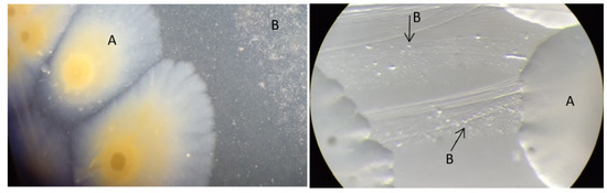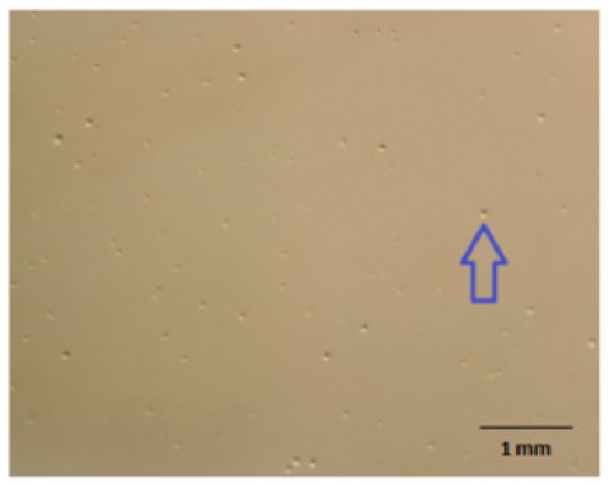 A pure culture of M. hyopneumoniae growing on Friis agar visualized under a stereomicroscope at 120× magnification. After the third subculture, the colonies became significantly larger, reaching 5–10 µM in diameter. A bigger colony is shown by the arrow.