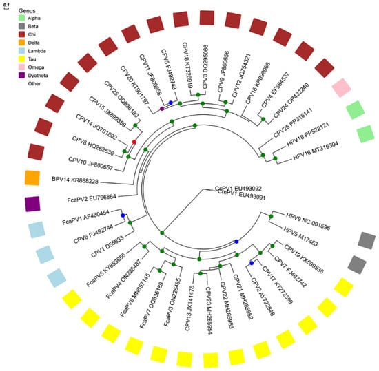 - Merchioratto, I.; Mucellini, C.I.; Lopes, T.R.R.; de Oliveira, P.S.B.; Silva Júnior, J.V.J.; Brum, M.C.S.; Weiblen, R.; Flores, E.F. Phylogenetic analysis of papillomaviruses in dogs from southern Brazil: Molecular epidemiology and investigation of mixed infections and spillover events. Braz. J. Microbiol. 2024, 55, 2025–2033. [Google Scholar] [CrossRef] [PubMed]