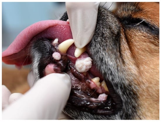 - Regalado Ibarra, A.M.; Legendre, L.; Munday, J.S. Malignant transformation of a canine papillomavirus type 1-induced persistent oral papilloma in a 3-year-old dog. J. Vet. Dent. 2018, 35, 79–95. [Google Scholar] [CrossRef] [PubMed]