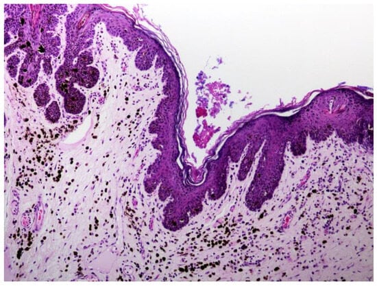 - Stokking, L.B.; Ehrhart, E.J.; Lichtensteiger, C.A.; Campbell, K.L. Pigmented epidermal plaques in three dogs. J. Am. Anim. Hosp. Assoc. 2004, 40, 411–417. [Google Scholar] [CrossRef]