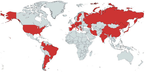 Figure 1. Distribution of clinical cases of Fusarium verticillioides. In red countries with at least 1 case of fusariosis caused by Fusarium verticillioides is reported.