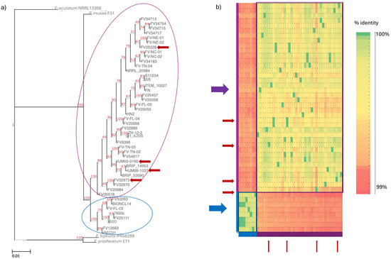 Figure 2. (a) Phylogenetic three based on the analysis of 18 conserved genes. IQ-Tree was used for model construction, tree construction and visualization. Numbers at nodes refer to the Bootstrap value. (b) FastANI results of F. verticilliodes whole genome alignment. Red arrows refer to human-derived strains; blue and purple colours highlight two distinct groups present in the tree.