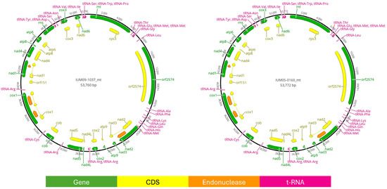 Figure 3. Graphical representation of assembled and annotated mitochondrial genomes of IUM05-0160 and IUM09-1037.