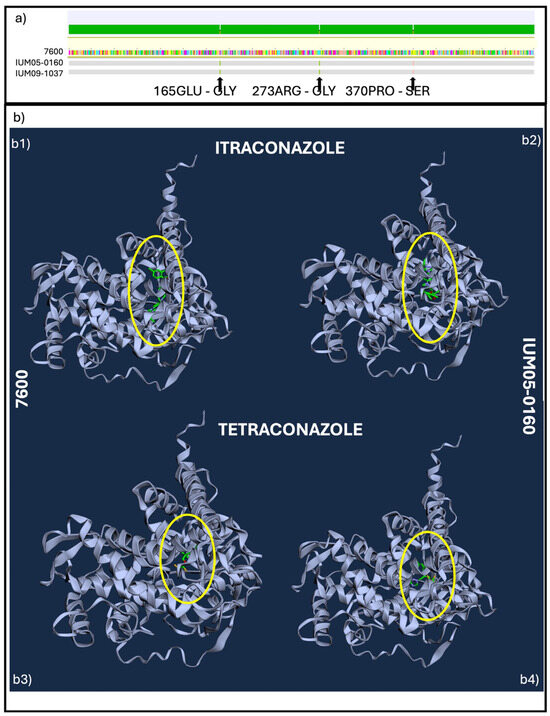 Figure 4. (a) Alignment of CYP51A aminoacidic sequences of 7600 (reference), IUM05-0160 and IUM09-1037, arrows indicate mutations compared with the reference. (b) Diffdock L output representing the point of interaction between (b1) itraconazole 7600 (MIC = 0.5); (b2) itraconazole IUM05-0160 (MIC = 4 for IUM05-160/MIC > 16 for IUM09-1037); (b3) tetraconazole 7600 (MIC = 1) and (b4) tetraconazole and IUM05-0160 (MIC > 16). Yellow circles indicate the position of potential interactions between the protein and fungicides.
