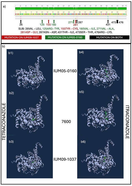 Figure 5. (a) Alignment of CYP51C aminoacidic sequences of 7600 (reference), IUM05-0160, and IUM09-1037; arrows indicate mutations compared with the reference. In red mutation only on IUM09-1037, in green on IUM05-0160, and black for both IUM05-160 and IUM09-1037, numbers are referred to the aminoacidic position of mutation of the 7600 sequence. (b) Diffdock-L output representing the point of interaction between (b1) tetraconazole and IUM05-0160 (MIC > 16 mg/L); (b2) tetraconazole and 7600 (MIC = 1 mg/L); (b3) tetraconazole and IUM09-1037 (MIC > 16 mg/L); (b4) itraconazole and IUM05-0160 (MIC = 4 mg/L); (b5) itraconazole and 7600 (MIC = 0.5 mg/L); (b6) itraconazole and IUM09-1037 (MIC > 16 mg/L). Yellow circles indicate the position of potential interactions between the protein and the fungicides.