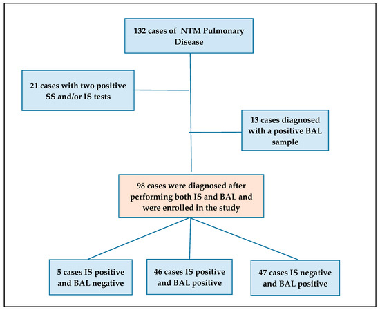 This retrospective observational study was conducted at the Respiratory Infectious Diseases Unit, National Institute for Infectious Diseases (INMI) “L. Spallanzani” Scientific Research and Treatment Institute (IRCCS), Rome, Italy, a tertiary care center for mycobacterial diseases. We examined 132 patients with NTM-PD observed from May 2018 to December 2023. All patients met the criteria for the diagnosis of NTM-PD [3,4]. For the study, we eliminated 21 patients who had two culture-positives of SS, without having performed BAL, and 13 patients in whom the diagnosis was made by BAL alone, without examining sputum samples. We then considered a sample of 98 patients, of whom we examined at least one induced sputum sample and BAL (Figure 1). The study was approved by the INMI Ethics Committee, “L. Spallanzani”, with decision no. 12 (17 February 2015); all enrolled patients provided written informed consent to the use of anonymized clinical data. We collected demographic, clinical, and laboratory data from medical records: age, sex, NTM species, PCR and culture results for NTM on BAL and IS, radiological pattern, and presence of comorbidities and/or immunosuppression.