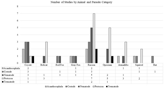 The findings included unique studies in raccoons (n = 14), opossums (n = 8), armadillos (n = 4), bobcats (n = 4), coyotes (n = 3), squirrels (n = 3), gray foxes (n = 1), red foxes (n = 1), an undeclared fox type (n = 1), and bats (n = 1; Figure 2). Some studies were conducted in multiple animal types and/or examined multiple parasite species. No studies on zoonotic enteric parasites in Florida’s rabbits or eastern moles were found in this search. Many species of ZEPs were identified by the study authors in the categories of acanthocephala, cestode, nematode, protozoa, and trematode. Several studies reported additional parasites with no known zoonotic potential. These parasites were not included in this review.