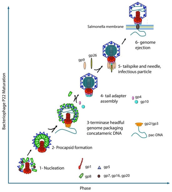 - Moore, S.D.; Prevelige, P.E., Jr. Bacteriophage p22 portal vertex formation in vivo. J. Mol. Biol. 2002, 315, 975–994. [Google Scholar] [CrossRef]