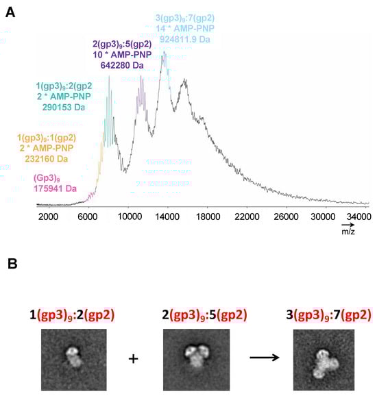 Mass spectrometric analysis of purified gp3:gp2 complex. (A) The differential assembly is consistent with at least two distinct gp3:gp2 populations of ~290 kDa (stoichiometry (1 × gp3) + (2 × gp2:AMP-PNP)) and ~642 kDa (stoichiometry (2 × gp3) + (5 × gp2:AMP-PNP)) and a ~925 kDa oligomer of the first two complexes combined (stoichiometry (3 × gp3) + (7 × gp2:AMP-PNP)). (B) Representative class averages of the three major assemblies identified by mass spec.