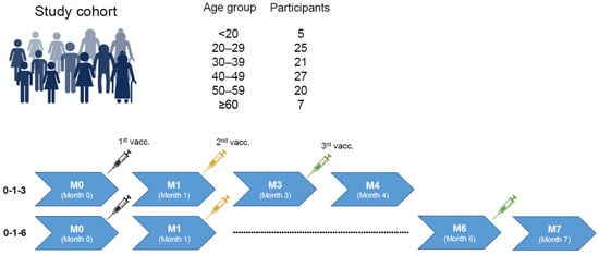 Study design and age distribution. Participants received the 3-dose vaccination series against HBV at months 0, 1, and 3 or 6. Blood was drawn directly before each vaccination and once after the 3rd vaccination. Created with BioRender.com.
