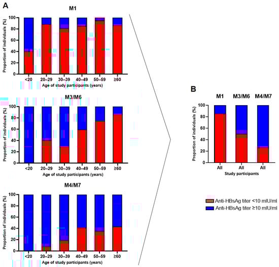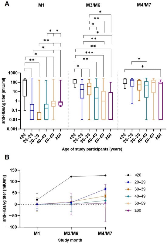 In order to assess the vaccine response, anti-HBsAg antibody levels were measured in serum samples taken before each vaccine dose and once after the third dose. Vaccine-induced geometric mean titers (GMTs) against HBsAg were detected in each study age group from M1 to M4/M7 (Figure 3). After the first vaccination, individuals under 20 years old showed significantly higher GMTs (20.13 mIU/mL) than the other age groups (0.06–1.19 mIU/mL) (Table S4). The second vaccine dose tended to induce higher GMTs in participants < 40 years (11.05–121.90 mIU/mL) than in participants ≥ 40 years (0.16–1.38 mIU/mL). Following the third vaccine dose, the younger (<40 years) age groups showed significantly higher GMTs (36.70–126.90 mIU/mL) than the older (≥40 years) age groups (5.3–16.74 mIU/mL). No significant differences in GMTs after the third vaccine dose were observed when stratifying the participants according to education level (Table S5). Overall, study participants < 20 years old exhibited the highest GMTs at any post-vaccination time point. These differences were most pronounced at M1 and M3/M6. Thus, the obtained data emphasize the induction of stronger HBV vaccine responses in younger individuals. However, incremental increases in antibody levels following each vaccine dose were particularly notable in middle age (20–59 years).