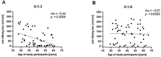 Correlation analysis of age and anti-HBsAg titers after the 3rd vaccination. Associations between the age of study participants and antibody titers after the 3rd vaccination within either the (A) 0-1-3- or (B) 0-1-6-month vaccination schedule were assessed by Spearman correlation.