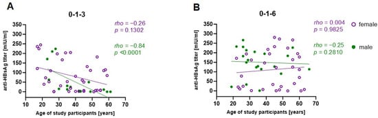 The observed differences in vaccine responsiveness across the age groups, as well as vaccination schedules, led to a further investigation of associations with those parameters. Anti-HBsAg titers after the third vaccination correlated negatively with age in the 0-1-3 group but not in the 0-1-6 group (Figure 5). Therefore, the obtained results suggest that impaired vaccine responses are linked to a shorter vaccination schedule and increasing age. Furthermore, separate correlation analysis using female and male vaccinees revealed that male sex, increasing age, and the 0-1-3 vaccination schedule were particularly significantly associated with lower antibody titers (Figure 6).