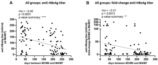 Spearman correlation analysis of anti-HBsAg titers, fold-change, and interval days from M3/M6 to M4/M7. Graphs depict data from all participants combined. (A) Correlation between anti-HBsAg titers at M4/M7 and interval days. (B) Correlation between fold-change of anti-HBsAg titers from M3/M6 to M4/M7 and interval days. The fold-change was computed by the ratio of the anti-HBsAg titer measured at M4/M7 to the titer measured at M3/M6. ** p ≤ 0.01; **** p ≤ 0.0001.