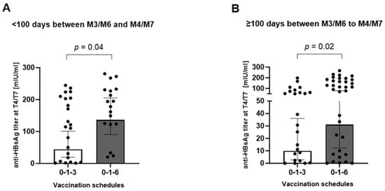 Impact of the interval time from M3/M6 to M4/M7 on anti-HBsAg titers between the vaccination schedules. Participants with interval days of (A) <100 and (B) 100–255 from M3/M6 to M4/M7 were stratified according to their vaccination schedule (0-1-3 or 0-1-6). Significance of between-group differences was assessed by Mann–Whitney U test.