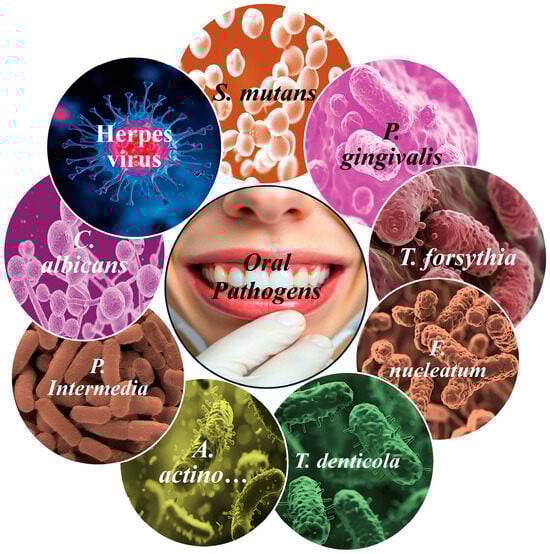 The human oral cavity hosts a complex microbiome of over 770 microbial species, although only a subset are pathogenic [], including bacteria [], fungi [], and viruses [] that can cause disease. The composition of the microbial communities varies among individuals and is influenced by factors such as diet, hygiene, genetics, and environmental exposure []. Unfavorable influences, including smoking, antibiotic use, and infections, can significantly alter the composition and structure of the oral microbiota, leading to oral and systemic diseases []. When oral microbiota dysbiosis occurs, certain commensal microorganisms in the mouth can become pathogenic, increasing in virulence and evading the immune defenses []. Beyond the oral cavity, humans host a diverse microbiota throughout the body, with the average adult microbiome weighing between 2 and 6 pounds and occupying approximately 3 pints in volume []. Most of the microbiota resides in the large intestine, which provides an expansive volume density for microbial colonization []. Oral pathogens come in a variety of sizes and shapes, each adapted to their environment and function, as shown in Figure 1.