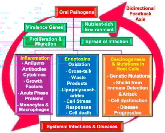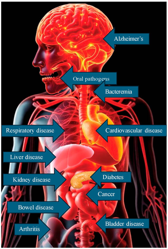 The bacterial cell count in the human microbiome surpasses that of human cells [], comprising nearly ten thousand distinct species []. Genetically, humans are much less diverse than their microbiota: while humans possess approximately twenty thousand genes, the collective human microbiome contributes around two million bacterial genes []. Oral pathogens can spread through the bloodstream, releasing pro-inflammatory cytokines and bacterial toxins like lipopolysaccharides (LPSs) that drive systemic inflammation []. This inflammatory response can contribute to chronic disease development and exacerbate the pre-existing health conditions in multiple organs and tissues throughout the human body [], as shown in Figure 2.
