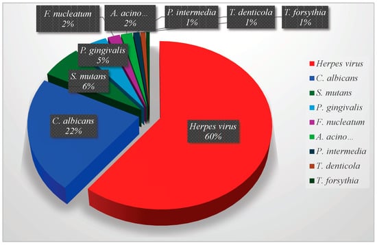 Genetic and peripheral factors lead to variations in the oral microbiome []. Homeostasis in the oral microbiome is preserved through commensalism and coexistence between microorganisms and the host []. However, cariogenic microorganisms cause dental caries, and other disorders and diseases, when the relationship with microorganisms becomes parasitic []. The oral microbiome of each person is quite distinct: while there are common species found in most individuals’ mouths; the specific composition of the oral microbiome can vary significantly from person to person []. Factors such as diet, oral hygiene practices, genetics, lifestyle choices (like smoking), age, health status, and even geographic location can all influence the unique microbial community in an individual’s mouth []. The individuality makes the oral microbiome as distinct as fingerprints, contributing to variations in oral health and susceptibility to diseases like caries, periodontitis, and other systemic conditions linked to oral health []. As a result, disease prevention strategies cannot be universally applied to all individuals. The risk of developing diseases is influenced by factors such as the composition of the oral microbiome, the presence and virulence of pathogens, and the immune system, which is in turn shaped by environmental and genetic factors []. The most significant oral pathogens [] according to the proportions of publications in PubMed (Supporting Information) are the herpes virus (60%), C. albicans (22%), S. mutans (6%) P. gingivalis (5%), F. nucleatum (2%), A. actinomycetemcomitans (22%), P. intermedia (1%), T. denticola (1%), and T. forsythia (1%), as shown in Figure 3.