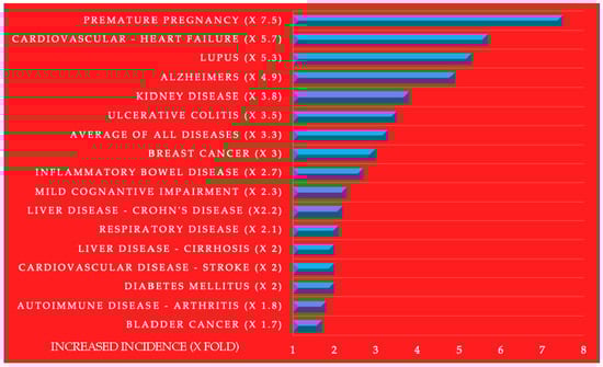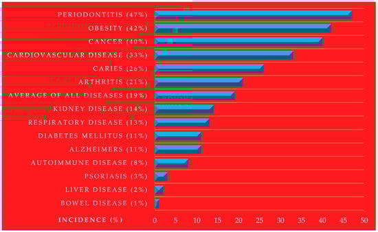 Ninety percent of the United States USD 4.5 trillion in annual healthcare expenditures are due to chronic and mental health conditions [,]. Heart disease and stroke are the leading causes of death for one-third of American adults, with one million deaths each year []. In the United States, 1.7 million people are diagnosed with cancer each year, and over 600,000 lose their lives to the disease, making it the nation’s second-leading cause of death [,]. Over 38 million Americans live with diabetes, while an additional 98 million adults in the U.S. have prediabetes, putting them at high risk of developing type 2 diabetes []. Diabetes can lead to severe complications, including heart disease, kidney failure, and blindness []. The most significant diseases according to the estimated proportions of American adult sufferers are the following: periodontal disease (47.2%) [], Obesity (42.4%) [], Cancer (40.5%) [], Cardiovascular disease (33%) [], untreated dental caries (26%) [], arthritis (21.2%) [], kidney diseases (14%) [], respiratory (13.2%) (asthma 8.9% and chronic obstructive pulmonary disease 4.3%) [], diabetes (11.3%) [], Alzheimer’s disease in Americans aged over 65 years (10.9%) [], autoimmune disease (8%) [], psoriasis (3%) [] liver disease (1.8%) [], and bowel disease (1%) []. These are shown in Figure 4.