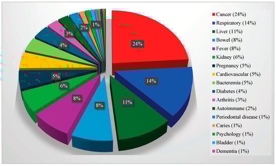 The most significant diseases associated with bacteria (oral pathogens) according to the proportions of publications in PubMed are the following: cancer (24%), respiratory (14%), liver (11%), bowel (8%), fever (8%), kidney (6%), pregnancy (5%), cardiovascular (5%), bacteremia (4%), diabetes (4%), arthritis (3%), autoimmune (2%), periodontal disease (1%), caries (1%), psychological (1%), bladder (1%), dementia (1%), lupus (1%), Alzheimer’s (1%), arteriosclerosis (1%), and psoriasis (0%). These are shown in Figure 5.