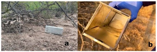 Sherman traps. (a) Sherman trap set near a rodent burrow. (b) Sherman trap baited with rolled oats.