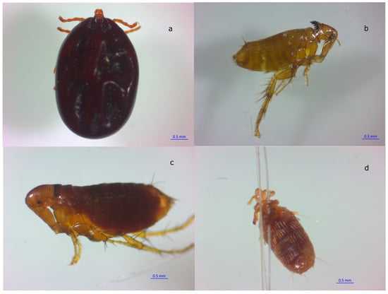 Ectoparasite identification was performed after DNA extraction from the specimens using an optical microscope (Primo Star Iled, ZEISS, Shangai, China). Additionally, microscope images were captured with an Axio Imager A2 (ZEISS, Göttingen, Germany). The identification of ectoparasite structures followed the taxonomic guidelines [,,,].