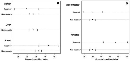 Cleveland diagram of (a) reservoirs vs. non-reservoirs in relation to sample origin (liver, spleen and blood) and (b) reservoirs vs. non-reservoirs in relation to parasite infestation. Black dots indicate the mean and standard deviation (in brackets).
