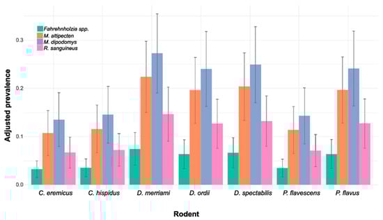 Adjusted means of ectoparasite prevalence by rodent and ectoparasite species. Each bar represents the adjusted mean prevalence for a specific combination of ectoparasite and rodent levels, with error bars indicating the standard error of the estimate.