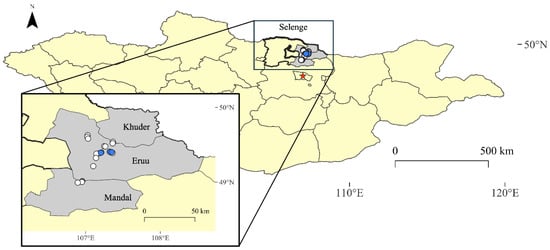 Maps were generated in QGIS 3.28.1 using GPS coordinate data collected for each collection event []. Shapefiles for Mongolia were obtained from https://data.humdata.org/dataset/cod-ab-mng (accessed on 29 July 2024).