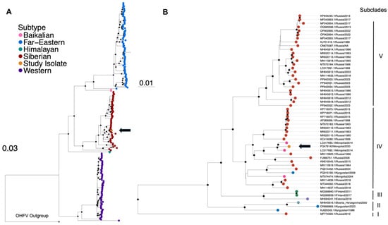 Recombination analysis detected 13 events impacting TBEV subtypes; however, there was no evidence that our isolate PQ479142 was recombinant (Supplementary Table S2). Likelihood mapping revealed a low percentage of unresolved quartets (1%), indicating sufficiently robust phylogenetic signal in the alignment to proceed with further analysis (Figure S1). Maximum likelihood trees inferred from the recombinant-free alignment and rooted with the outgroup Omsk hemorrhagic fever virus show distinct clades for the five subtypes with strong branch support for each clade: Far Eastern, Baikalian, Siberian, Himalayan, and Western (Figure 2A). Our consensus sequence clusters within the Siberian subtype that includes isolates from Mongolia, Russia, Estonia, Finland, Bosnia and Herzegovina, and Kyrgyzstan (Figure 2B). The Siberian subtype comprises highly divergent isolates from different countries, showing no geographic compartmentalization and forming five subclades, as defined by monophyletic clades with branch support of >90 (Figure 2B).